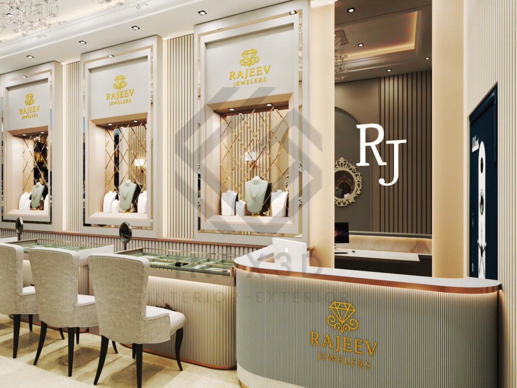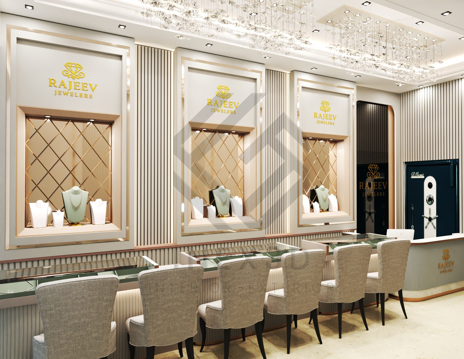 A stunning crystal chandelier graces the ceiling, enhancing the overall luxury and making the space brighter and more inviting. The brand identity of Rajeev Jewelers is elegantly incorporated through logo placements at strategic points, reinforcing exclusivity and trust.